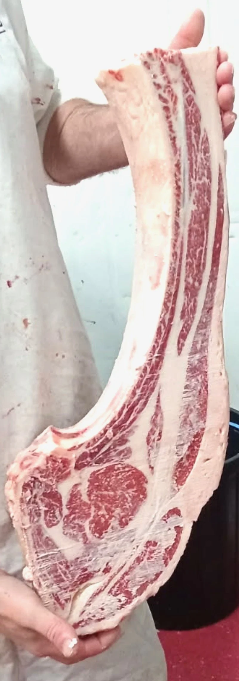 Our beef is predominately Marbling score of 6-7 plus. We cannot guarantee the marbling score for each body of beef that we sell from the farm although consistently our Marbling is BMS 6-7 plus. Our genetics are high marbling Angus herd with high marbling full blood Wagyu genetics. Our Bulls are of Tajima bloodlines, which is the genetics known within the Japanese black Wagyu breed to produce the highest percentage and best quality marbling which is known to yield superior meat.